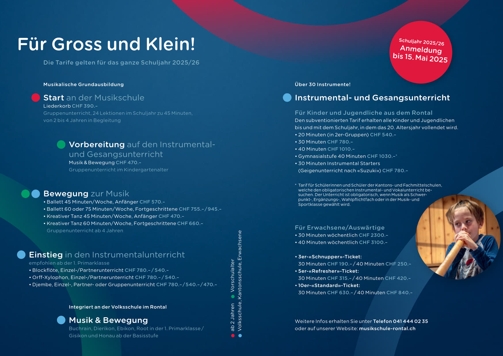 Hörbar - spürbar - kreativ! Herzlich Willkommen an der Musikschule Rontal! Vor Ihnen liegt das neue Schulprogramm für Kinder & Jugendliche. Bereits Kinder ab zwei Jahren finden in den Einstiegskursen den spielerischen Zugang zur Musik.